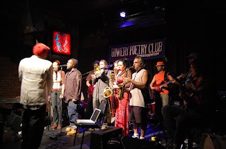 This rag-tag collection of twenty or so vocalists, horn players, guitarists, percussionists, keyboardists, bass player—even harmonica player—is guided by group bandleader Greg Tate. The guidance comes in the form of “conduction,” a system whereby Tate uses facial and hand gestures to direct different sections or individual players of the band to do certain things when the cue is given. Those certain things can be a change-up in rhythm, repeating a riff, adding or subtracting horn charts, or just about anything that can tweak or completely change the harmonic structure of a song. Anything goes with this band.